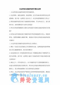 社会养老比家庭养老更可靠自由辩一.社会养老比家庭养老更具有资源优势。1.社会保险,退休金制度,商业保险,近几年涌出的多样化社会养老保险,是不是一定程度上显示出了,社会养老资源供给方多元?2.然而家庭养老更多基于家庭的经济基础,子女外出打工,老人贫困生活,如何保障老年人的生活质量?3.所以在养老资源提供方面社会养老是不是要比家庭养老更具有保障?4.因为社会养老相比较于家庭养老在养老资源提供方多元,资源多样化,使得资源输入源源不断,难道还不是社会养老比家庭养老更可靠吗?二.社会养老比家庭养老更具有形式上的保证。1.烟台一位老人吴金友被儿子打到颅内出血,这种家庭养老却带来老人身心健康的损害,您方如何解决?2.而民政部出台《养老机构管理办法》明确规定要求了保障老年人的生活质量,是不是一定程度上减......