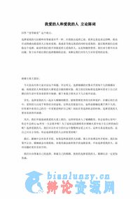 我爱的人和爱我的人立论陈词回答“坐等被爱”这个观点:选择爱我的人结婚和坐等被爱并不一样,在我做出选择之前,我肯定是追求过的啊,我也许试图感动我爱的人让他来爱我,我或者寻找过我爱的同时也爱我的,最后既然我们会面临这个选择,就说明我们找不到我爱的又爱我的人,这是辩题的背景,我们双方都不应该回避,您方也不能以我们选择婚姻的态度,来断定我们对待人生对待爱情的态度。谢谢主席大家好:今天很高兴和大家讨论这个辩题,开宗明义,选择婚姻的对象关乎到每个人的婚姻幸福,而我爱的人和爱我的人谁更适合做结婚对象,我方的比较标准是选择何者对于自己在婚后的生活中更容易获得幸福感,接下来我方将从以下几点展开论述......